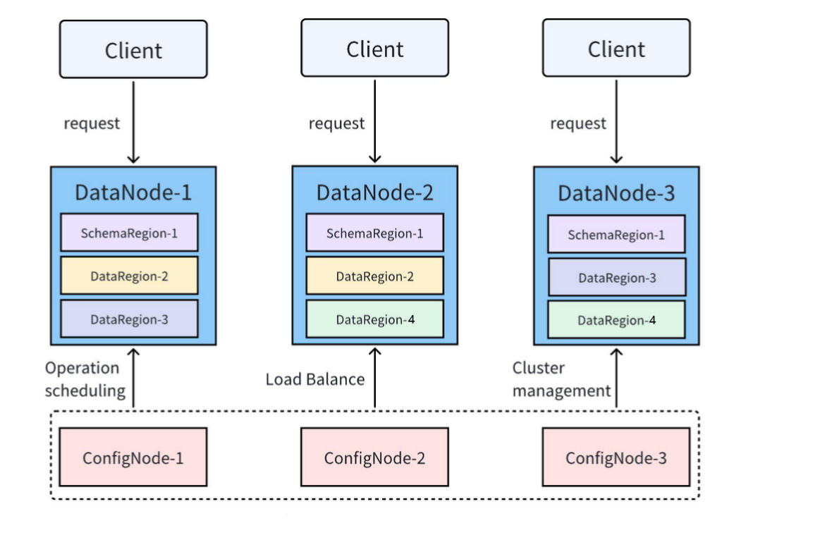 - ConfigNode (Management Node) Manages cluster metadata, configuration, user permissions, schema, and partitioning. It also handles distributed scheduling and load balancing. All ConfigNodes are replicated for high availability.