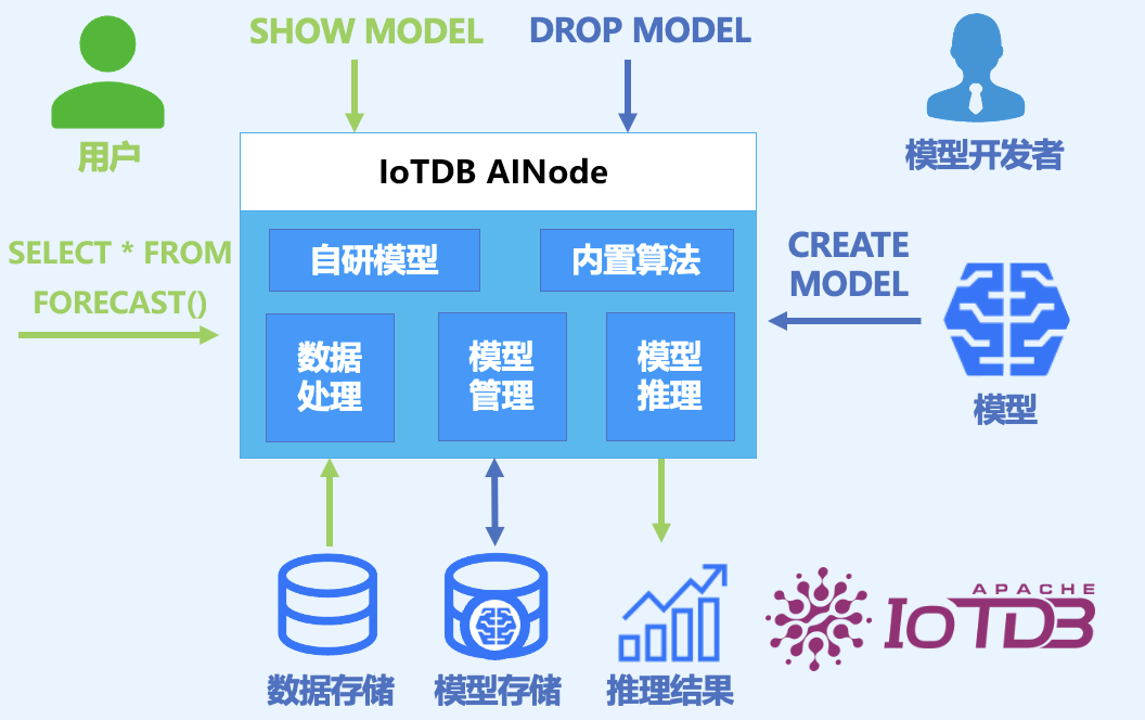 - 创建(Create): 将外部设计或训练好的模型文件或算法加载到 AINode 中,由 IoTDB 统一管理与使用。